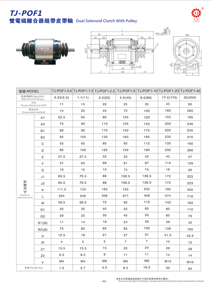 【天機(jī)傳動】雙電磁離合器組合體附雙皮帶輪(TJ-POF1),或稱之為雙重電磁離合器組,由兩個TJ-A型摩擦式電磁離合器組成。獨特設(shè)計的組合,摩擦部不易磨耗,動作精確、轉(zhuǎn)動部分慣性小。其工作原理與TJ-POF2型雙電磁離合組一樣,該型雙電磁離合器組合適,常規(guī)扭矩 6Nm400Nm。